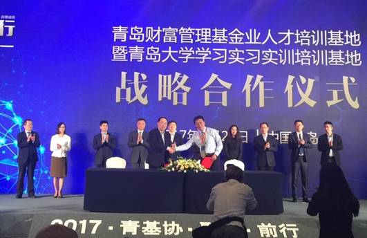 5月25日,青岛财富管理基金业协会成立两周年高峰论坛暨蓝色经济区(青岛)产业投资基金管理有限公司揭牌仪式,在青岛香格里拉大酒店召开,“蓝区基金“青岛管理公司正式揭牌成立。于永明副校长出席本次高峰论坛,并代表我校与协会签署“青岛财富管理基金人才培训基地暨星空体育官方网站学生实习实训基地“战略合作协议。学院院长周升起参加本次高峰论坛并见证战略合作协议的签署。