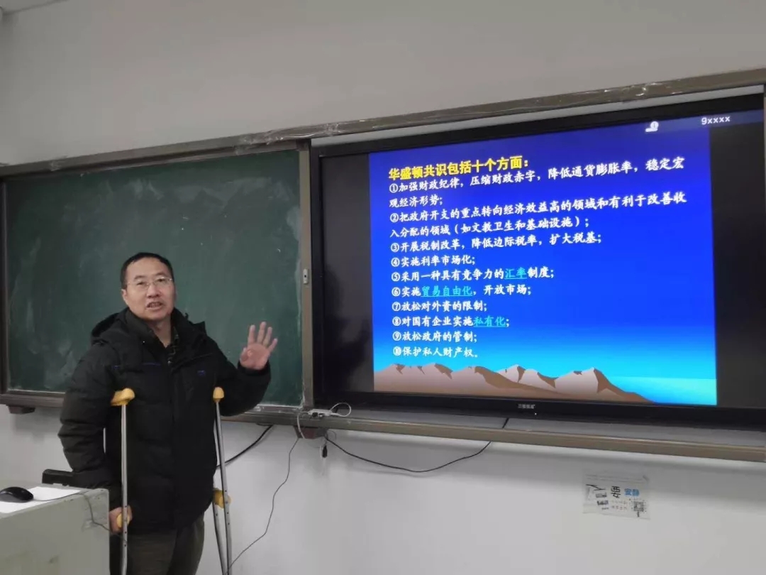 “华盛顿共识包含十个方面,首先就是加强财政纪律、压缩财政赤字……”路过星空体育官方网站研究生教室,郑玉琳老师的声音洪亮清晰,但也许没有人能想到,这位老师正拄着双拐为学生上课。据郑玉琳说,自己的腿伤是去年11月份去外地出差时,不慎踩空造成的脚跟骨粉碎性骨折,在医院做过手术后现在处于康复期,只能够拄着拐杖走路。
