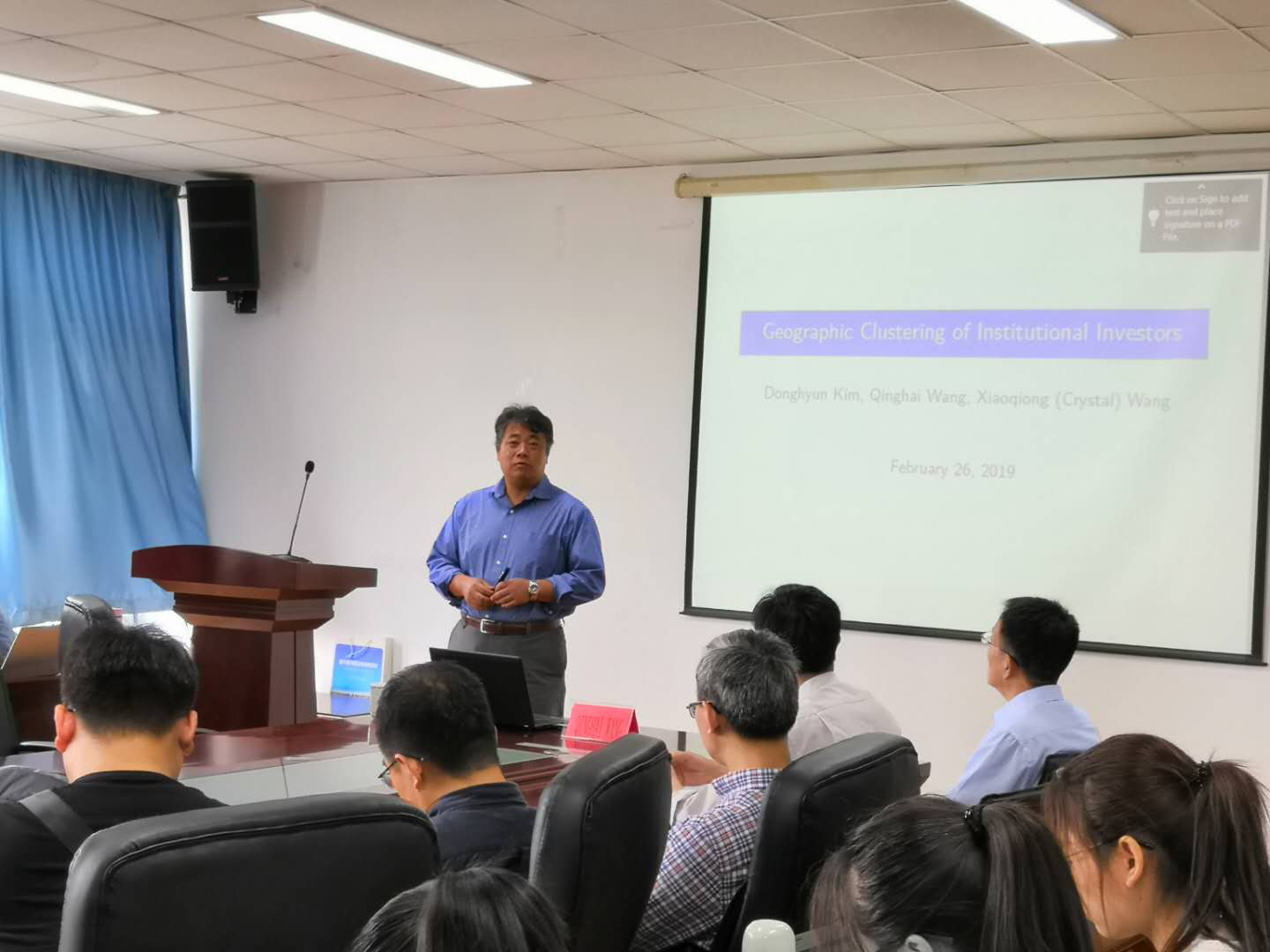 2019年6月14日上午,QINGHAI WANG教授应邀到星空体育官网开展学术交流与指导,并做客星空体育官方网站2019第15期“经济学名家讲堂”,为师生做了《Geographic Clustering of Institutional Investors》的精彩学术报告。