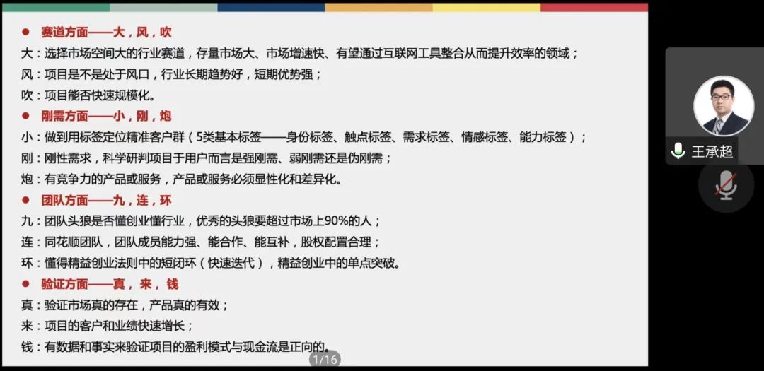 会议伊始,王承超老师介绍了“新文科”参与双创的背景及相关政策,分析文科参加双创的优势和劣势,提出以“新文科+”作为新文科赛道的双创切入点。接下来,王老师又从项目的底层逻辑和选题来源两方面进行了深入细致的讲解。在此过程中,王老师指出,创新创业项目要从技术创新、商业模式、落地实操、项目承现为底层逻辑逐步进行培育和建构。针对同学疑惑的选题问题,王承超老师介绍了项目选题的七个来源,提出通过聚焦的形式逼近一个细分特色领域来增强选题的吸引力的方法。最后,王承超老师又为同学们介绍了自查优化双创项目的“十二字诀”。