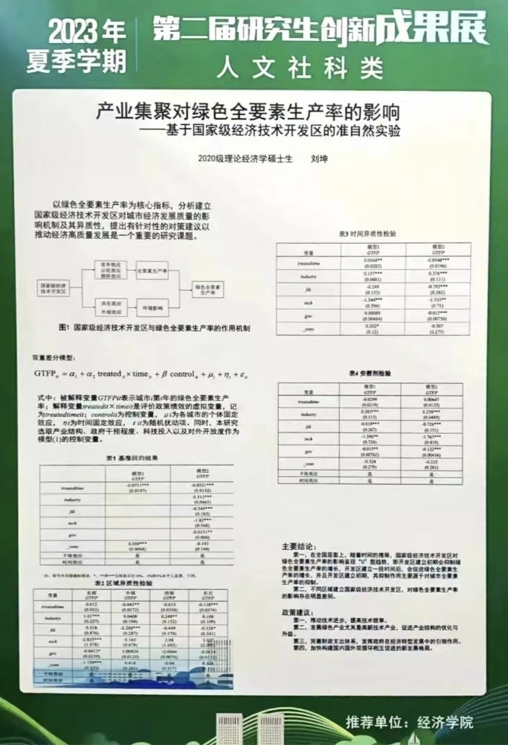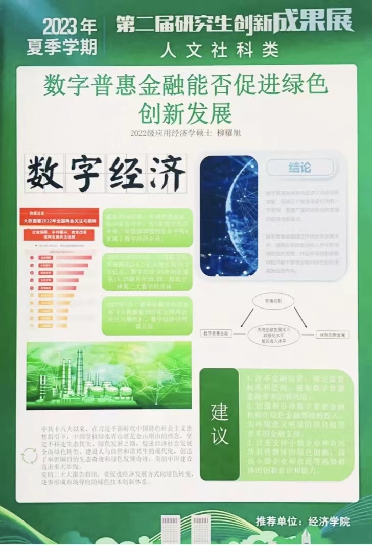 会后评审团专家从星空体育官方网站研究生20余项代表性创新成果中评出了“校优秀学术海报奖”和“院优秀学术海报奖”。其中,《长期护理保险对中老年人心理健康的影响》和《基于中介效应模型的地区财富对绿色技术创新影响研究》获评校优秀学术海报奖,《数字普惠金融能否促进绿色创新发展》等19个成果获评院优秀学术海报奖。让我们一睹思想碰撞的火花。