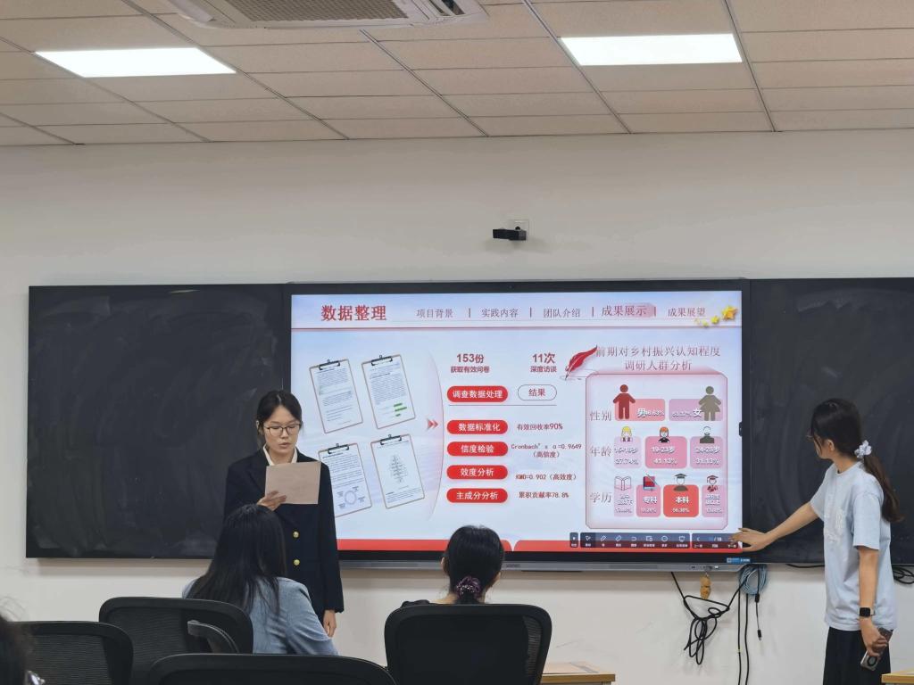 答辩现场,气氛热烈,亮点纷呈。各支团队围绕乡村振兴、产业发展、基层治理、金融普惠等主题,通过详实的数据、生动的案例与深入的思考,全面复盘了暑期深入乡野田间的实践历程。他们或聚焦特色农业的数字化转型,或探访乡村文旅的融合路径,或调研普惠金融的落地成效,以经济学子的专业视角洞察社会现实,提出了富有建设性的思考与建议。队员们沉稳的陈述、缜密的逻辑与从容的应答,充分彰显了经院人“经世济民”的担当与“学以致用”的能力,赢得了现场评委与观众的阵阵掌声。