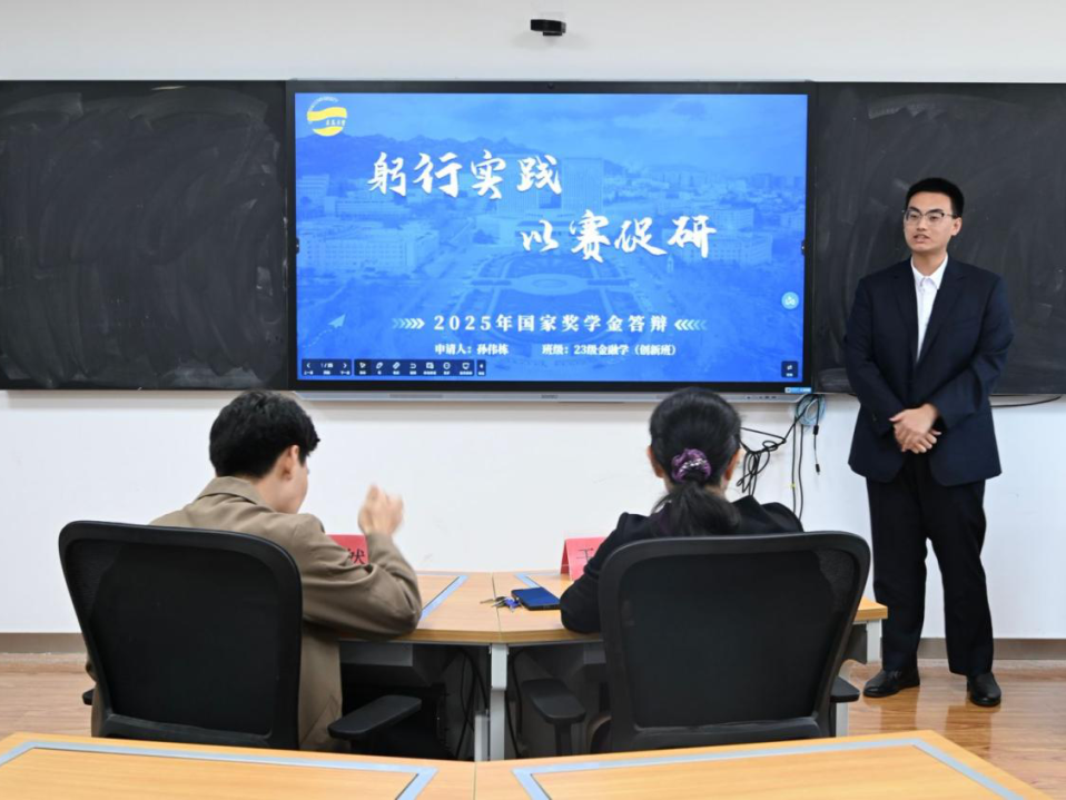 经过前期个人申报和学院初审,共有10名同学进入答辩环节。答辩过程中,候选学生围绕学业成绩、竞赛与科研成果、社会实践、志愿服务、综合素质等方面进行展示,充分展现了经院学子扎实的专业基础、积极的创新意识和良好的精神风貌。每位同学在有限的时间内,不仅汇报了自己的成绩与收获,也分享了成长过程中的感悟与展望。评审小组始终秉持公平、公正、公开的原则,以高度负责的态度,认真听取每一位候选人的现场阐述,并结合其书面申请材料进行全面审阅与慎重评议。