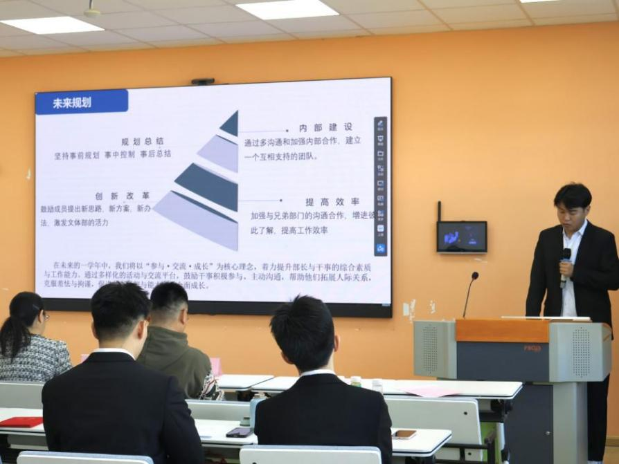 文体部部长李浩楠围绕校园文化活动、体育赛事等内容,阐述了新一届部门工作目标与实施计划。
