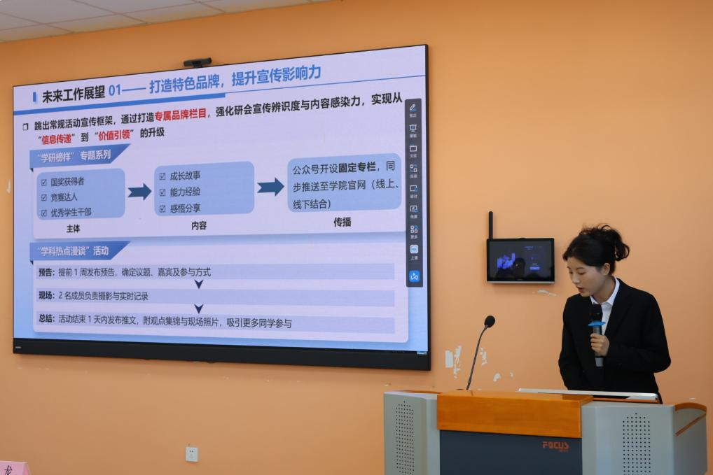 宣传部部长向昕蓓围绕活动宣传、新媒体运营等内容,提出了新一届部门宣传工作的目标与创新方向。